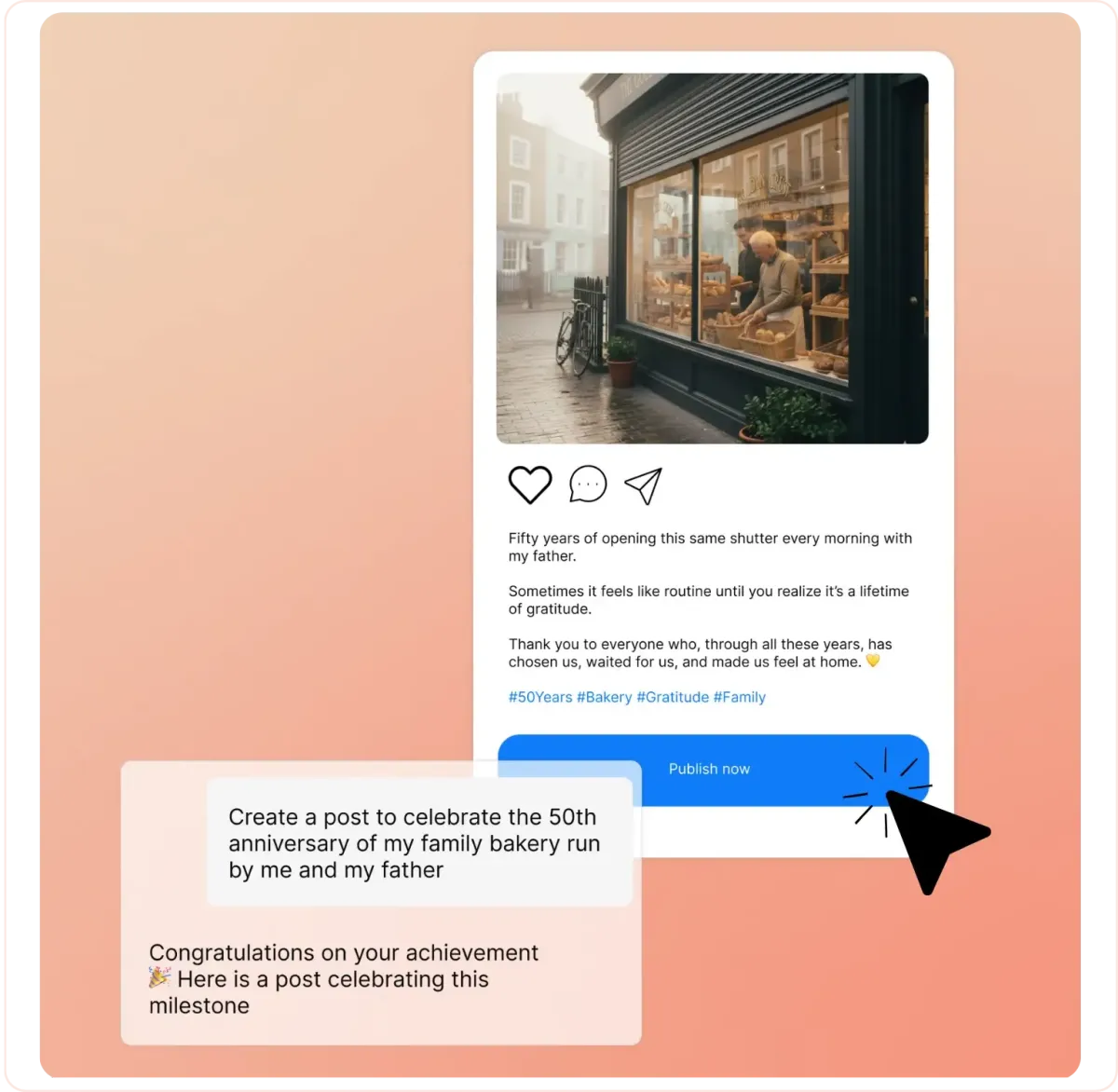 Want to announce something special a new product, a team member, or an event? Use the built-in AI chat to generate one-off ready to publish or schedule posts in seconds.