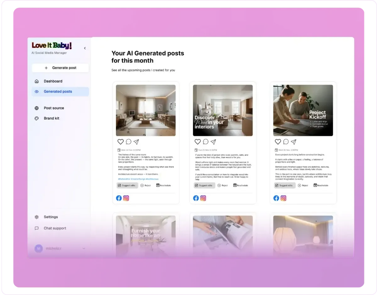 See all your upcoming posts in a clear calendar view or switch to a vertical list for quick scanning. See what Love It Baby has created for you, day by day and if needed, you can approve, edit, or reject any post before it goes live. Stay in control, without doing the heavy lifting.
